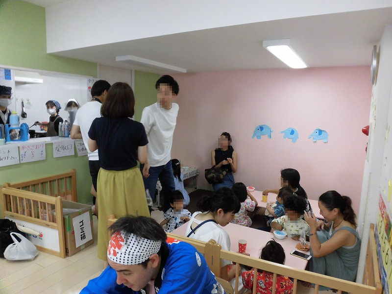 下の写真は「知育ゲームコーナー」と「飲食コーナー」。知育ゲームで頭を使った後は、かき氷・フランクフルト・フライドポテトで一休み(^-^)。