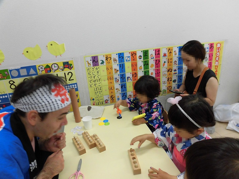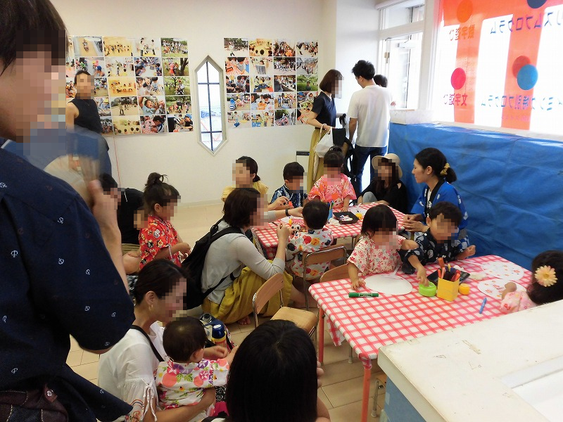 写真は「工作コーナー」手作りうちわを作ります(^-^)。出来上がったうちわをパタパタパタ♪涼しいね〜♪
