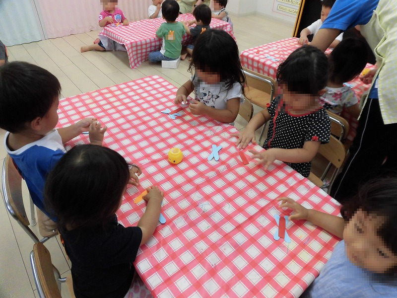 写真は敬老の日のプレゼントを作る園児たち♪左下写真は赤とんぼ作りの赤組(2才児)園児♪右下写真はスタンプ押絵に挑戦する黄組(0才児)園児♪