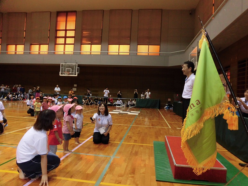 選手宣誓「うんどうかい!ガンバリます!」大きな声で言えました♪今回の運動会はウェリナ保育園が赤チーム、武庫之荘ウェリナ保育園は白チーム、ウェリナナーサリースクールが青チームです。体操がすんだら早速競技の開始です。