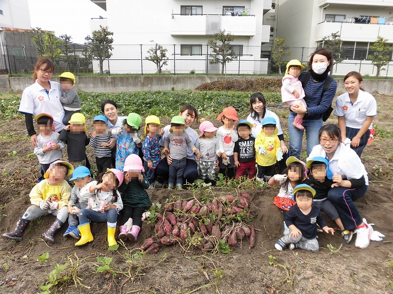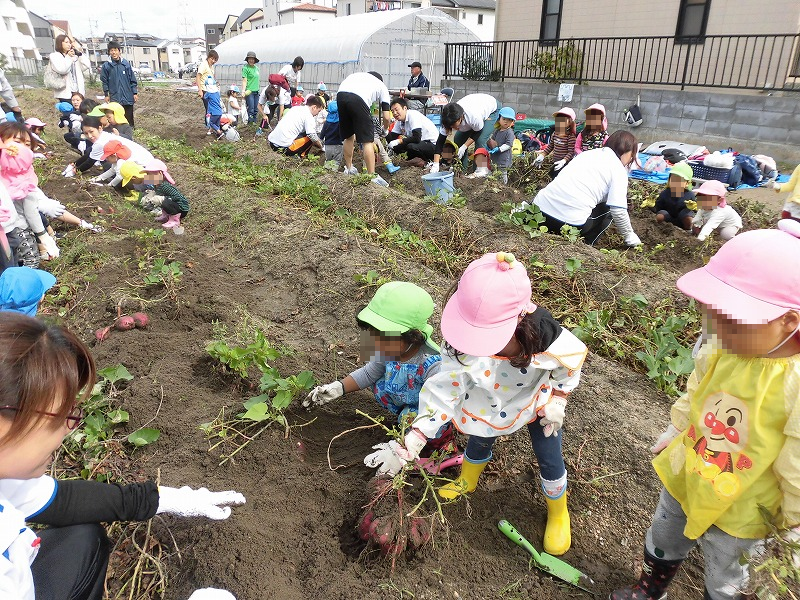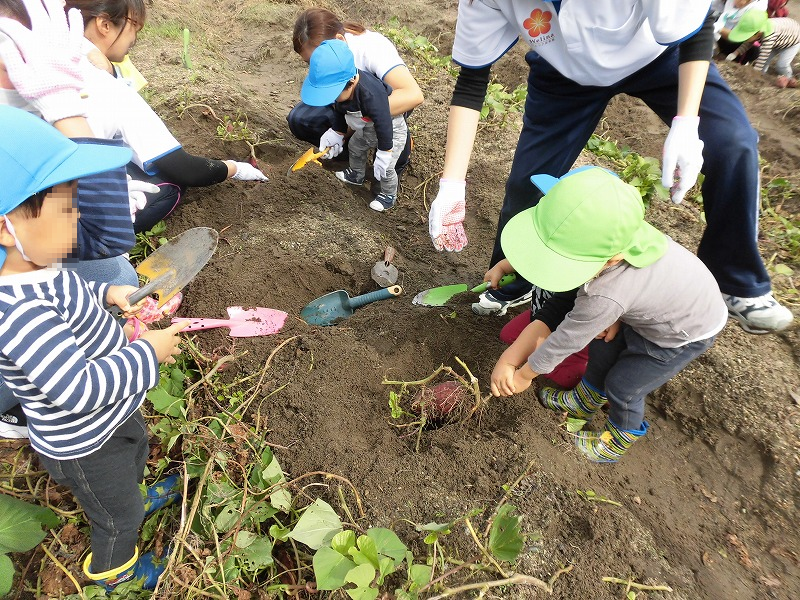 みんな一生懸命お芋を掘ります最初はスコップを使って・・だんだん面倒くさくなって直接手で(笑)「うんしょ、こらしょ」力いっぱい蔓を引っ張る子も(^-^)。