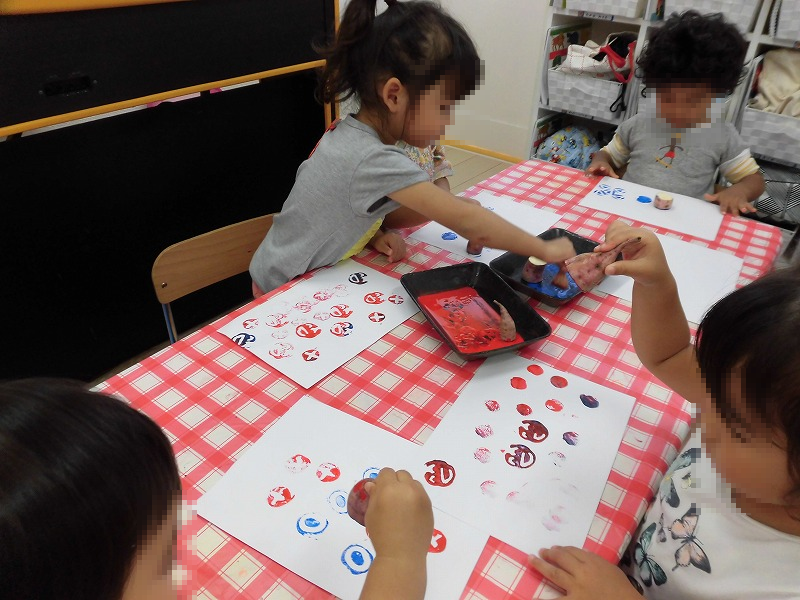 自然工作の時間は芋版画。はぁ〜♪ぺったん、ぺったん、ぺったんなぁ〜♪