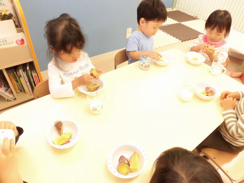もちろんオヤツにはホクホクの蒸し芋が♪赤組さんは上手に皮をむいて食べています(^-^)。