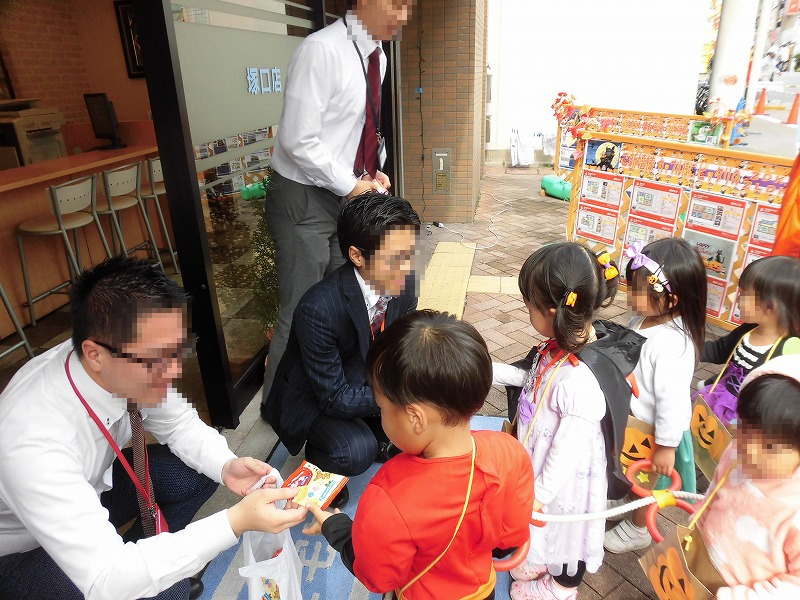 1件目は駅前の不動産屋さんへ「Trick or Treat!」「お化けだぞぉー」「〇△×□※ー!」(^o^)。