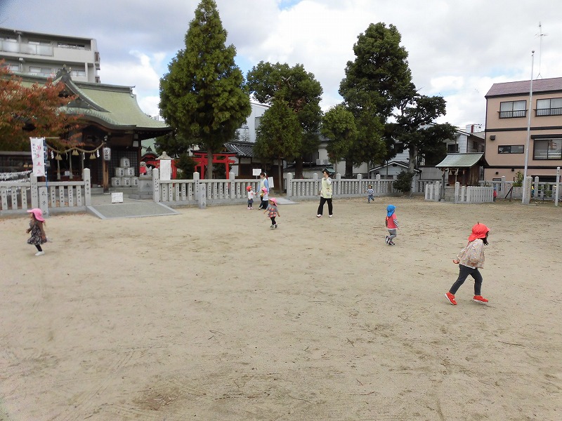 落葉が集まったら神様にご挨拶「いつもありがとうございます!」。ご挨拶がすんだら広い境内を走り回っていました(広い場所に来るとなぜか走り回る園児たち)微笑ましい光景に先生達もニンマリ(^-^)。