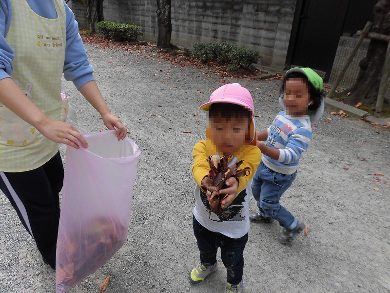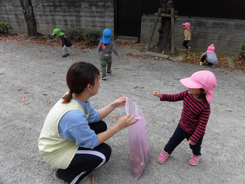 秋本番、この日は塚口神社の参道に落葉ひろいに行ってきました(^-^)。子ども達、いつもと違うお外遊びに目をキラキラさせて一生懸命落葉を集めます。