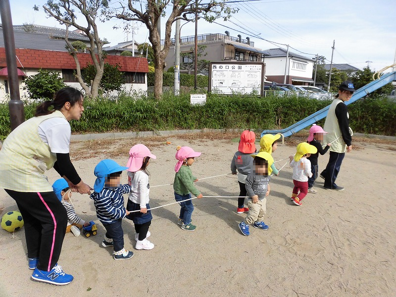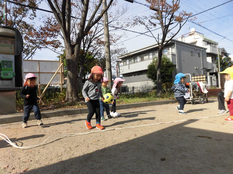 この日はなわとびを使って縄跳び(縄またぎともいいます・笑)ウネウネと動く縄をタイミングよくまたいでいきます(^-^)。子供達の大好きな電車ごっこも(^-^)。