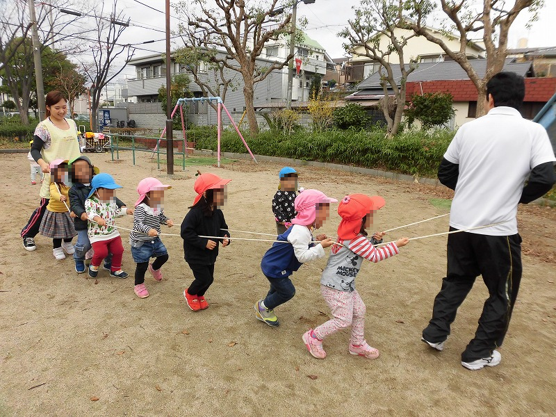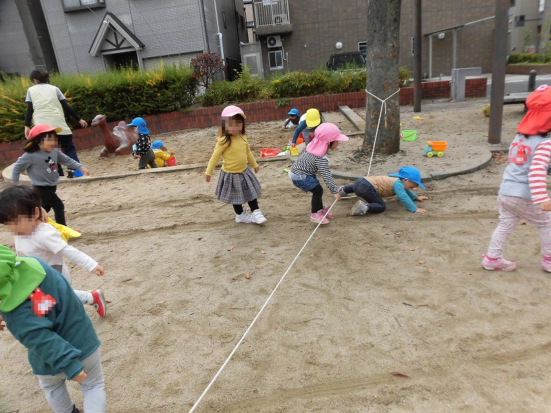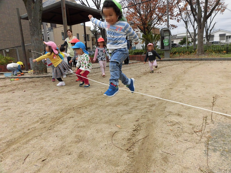 鬼ごっこ、むっくり熊さん、お相撲等々(^-^)写真は最近ブームの縄跳び縄を使った遊び。みんな楽しそうー!