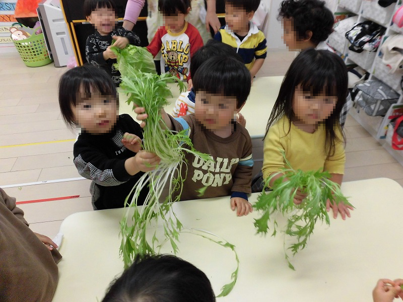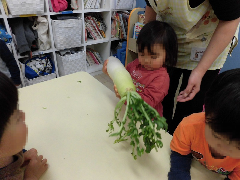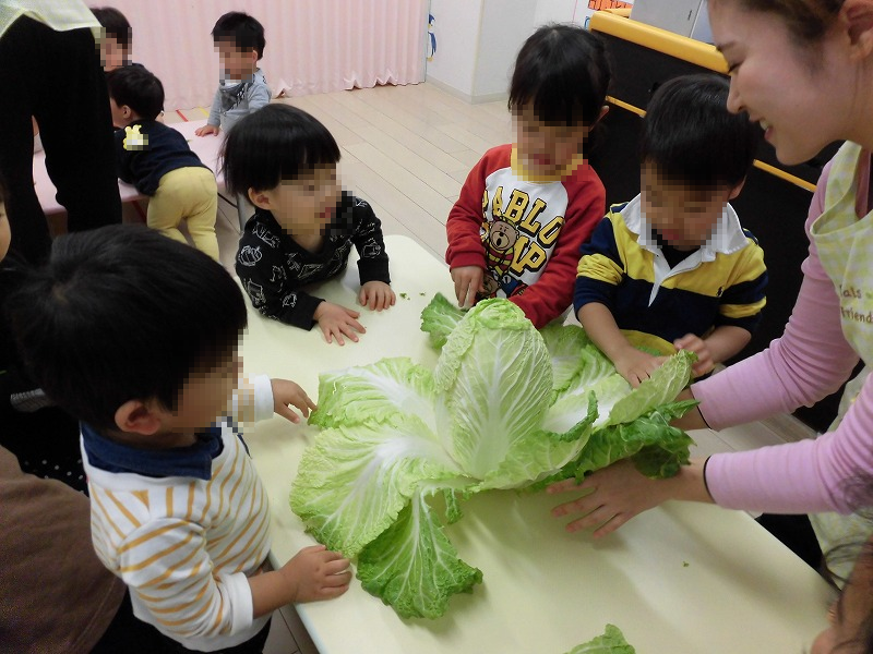 先生から冬野菜の意味を聞いたらー♪白菜、大根、水菜を手に取ってー♪園児たちキラキラした目で冬野菜にふれています(^-^)。