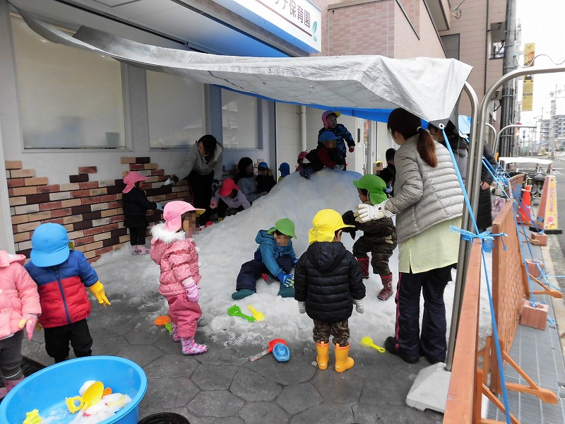 悩んだ末、今年の雪遊びは武庫之荘ウェリナ保育園の園頭にテントを張って行ないました(^-^)