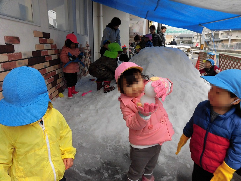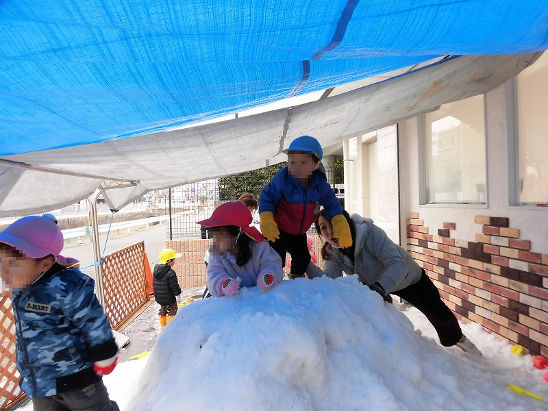 初めて雪を見た園児(1才児と0才児)は、久しぶりに出ました「かたまりの技」(笑)。雪遊びを楽しみにしていた園児(2才児)は雪山に突撃ー!「うおぉぉー」(^o^)。