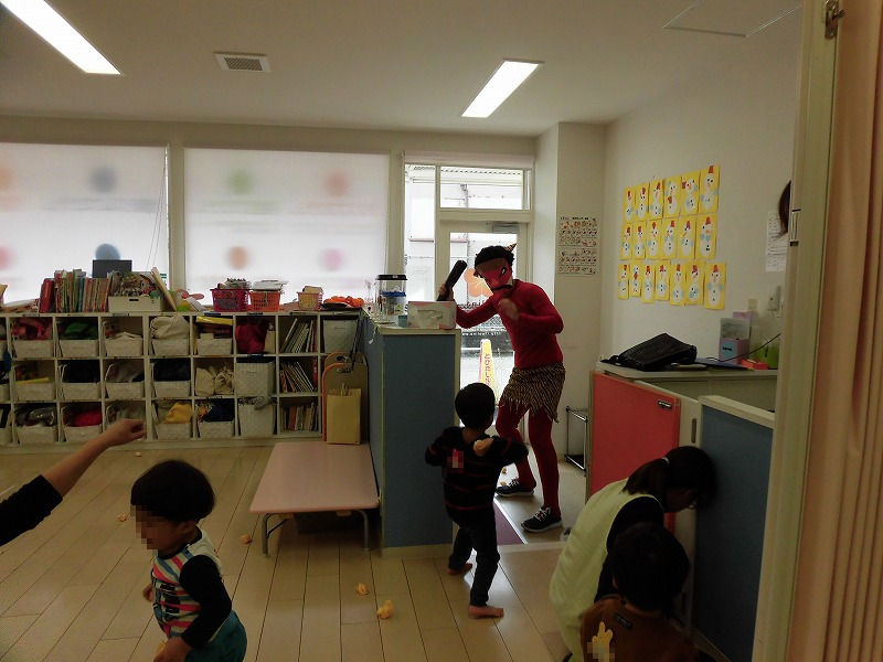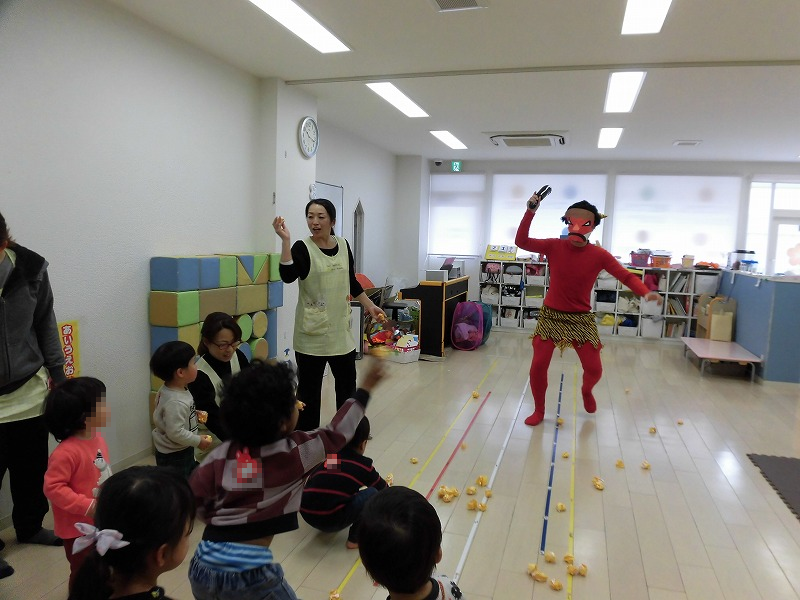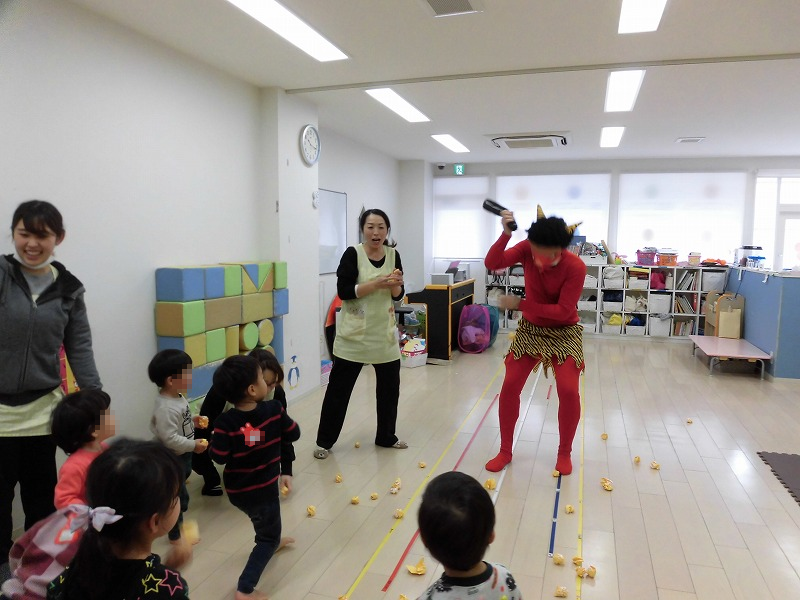 今日は豆まきをしました。突然保育室に赤鬼が入ってきました(^-^)。園児たちは手作り豆で応戦します!「鬼は―外!」「うぎゃー」「〇×△□※〜」。