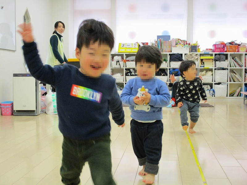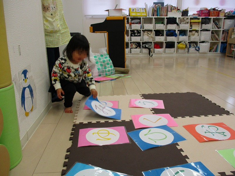 写真は名前探しかるた取りの要領で名前の文字を探します。写真は1才児(満2才)さん。ニコニコ楽しみながら探しています(^-^)「はい、正解!」。