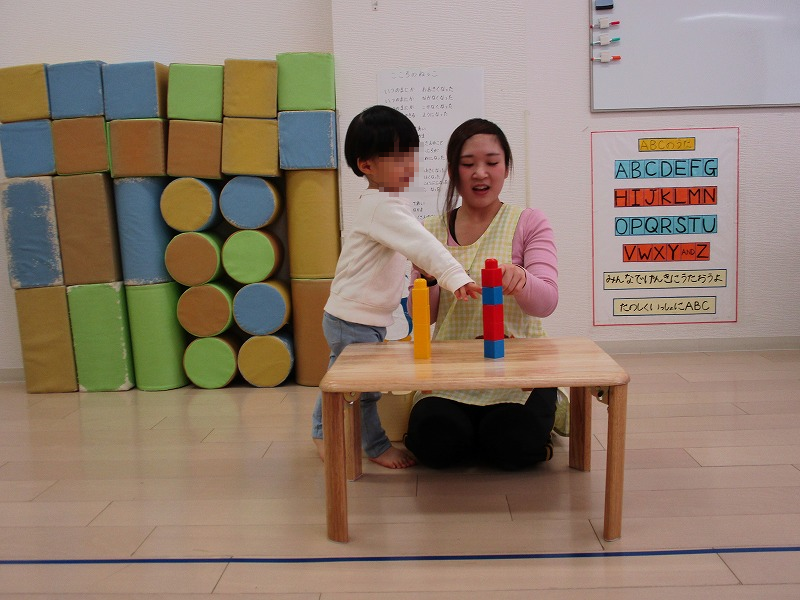 写真は数字遊びの一コマ。「高い低い」「長い短い」「重い軽い」「大きい小さい」などなど・・数字の概念はいろいろな遊びの中に溢れています(^-^)。