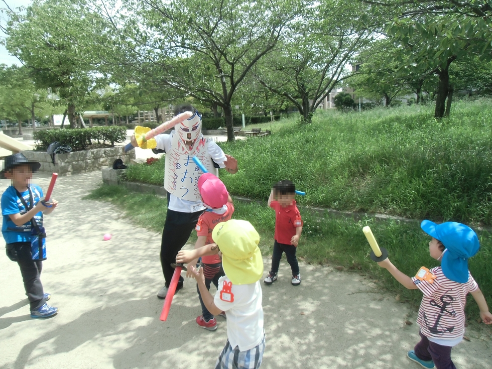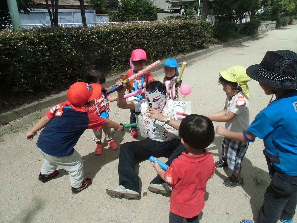 [いてっ、誰だ思いきり叩いたのは・・・こらこら、お尻に剣を刺してはダメです・・・いたい!。。。二度と魔王役はしないと思った園長でした](笑)。