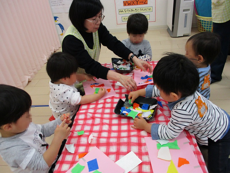 写真は貼り絵で菜の花を作っています。子ども達の感性で色とりどりの菜の花が出来上がりました。上手に作ることが目的ではないんですよ(^-^)。自由な発想から最高の作品がうまれるんです。