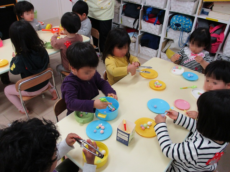 下右の写真は「おはし遊び」(モンテソーリー教育という所もありますね)。上手におはしで遊びます。すごい集中力!さすがウェリナの子ども達(^-^)。
