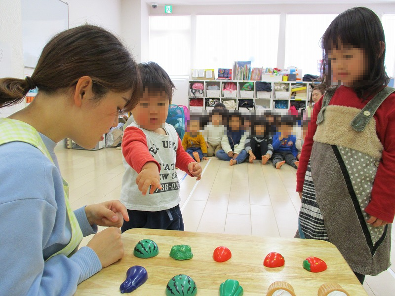 赤組さん(2才児)とオレンジ組(1才児)がペアになってお買い物。赤組のお兄さんお姉さんはオレンジ組さんにお声をかけたり手をひいたり、上手にお買い物をリードしています。オレンジ組さんは嬉しそう(^-^)。