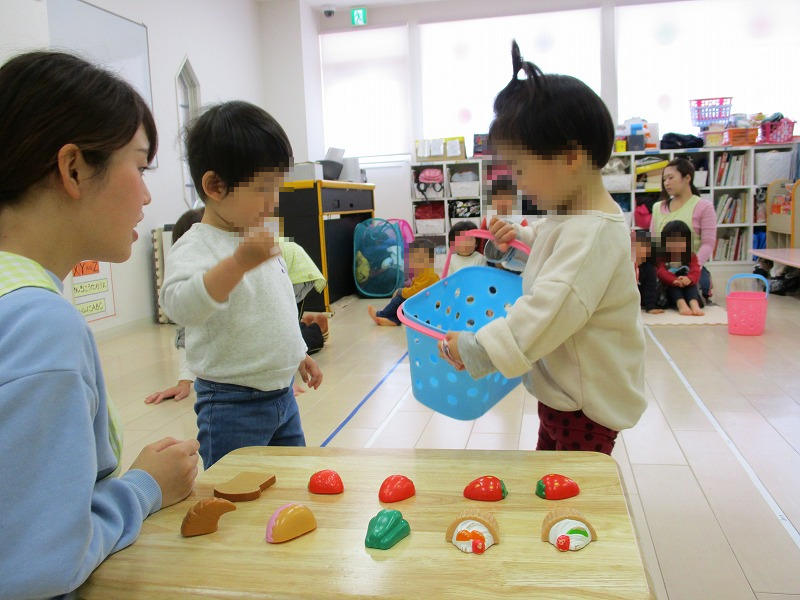 写真は午後の設定保育。この日は「お買い物ごっこ」(^-^)。