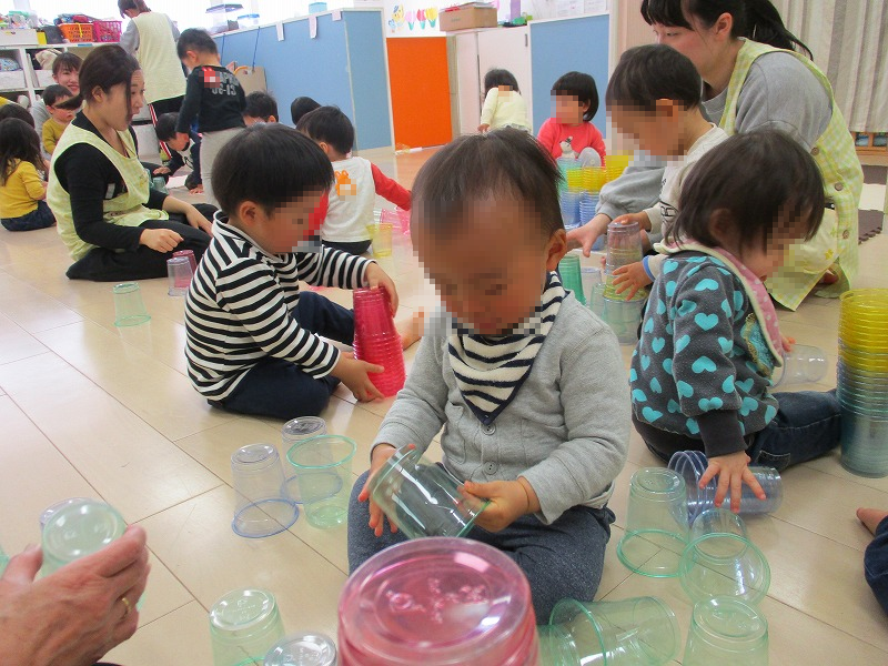 先生が床に色とりどりのコップブロックを広げると、泣いている子も必ず興味を示して触りたがるんですよ(今年は泣いている子はほとんどいないんですが・笑)(^-^)。
