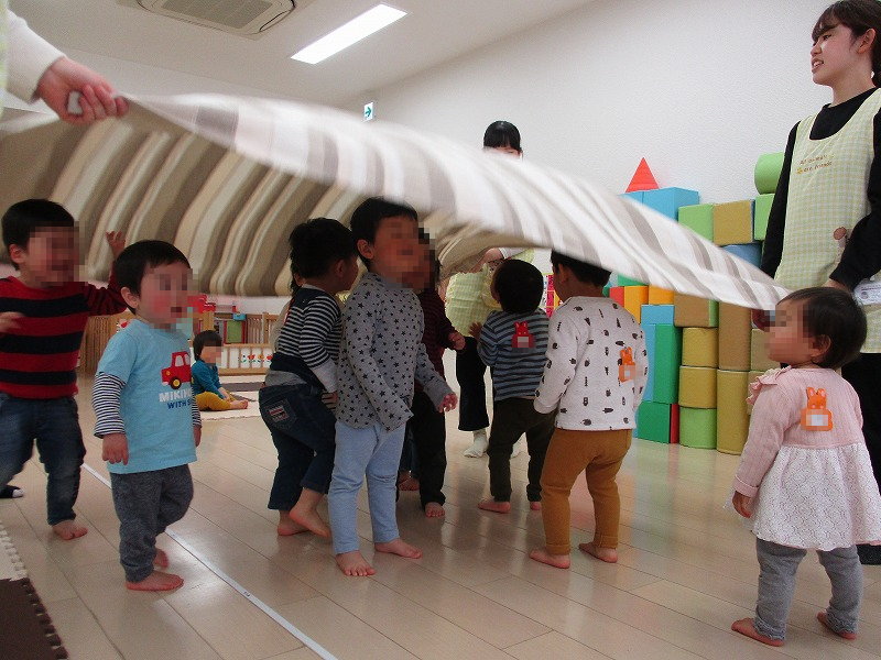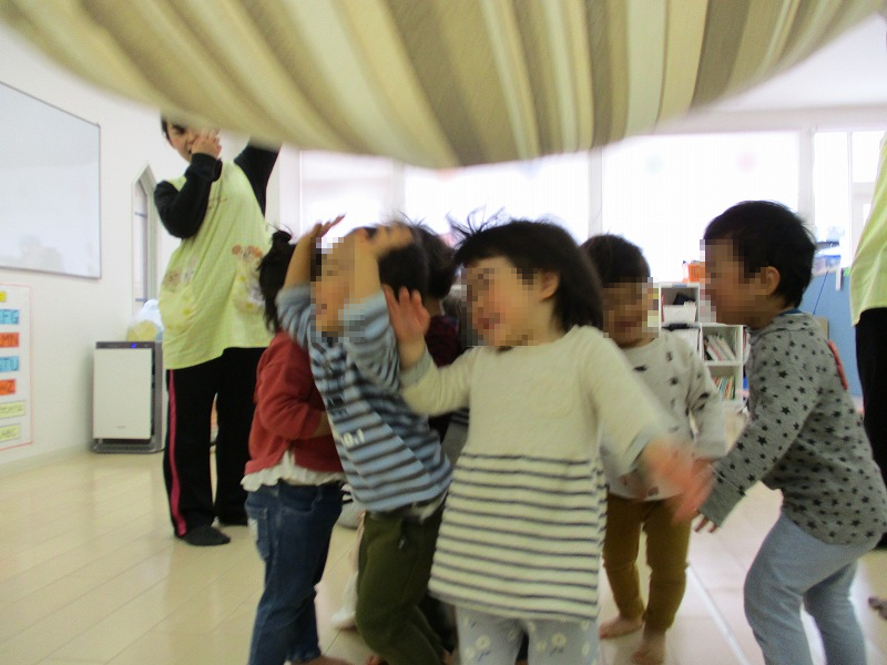写真はピアノの音に合わせてリトミック(^-^)。下の写真は「魔法の絨毯」遊び、風が気持ちいいね!楽しいね♪