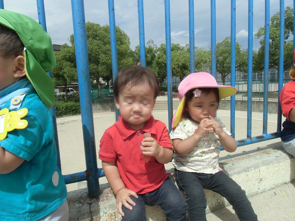魔王を倒した後はお城の上でアイス(100%果汁チューペット)でしばしの休息。子天使ちゃん達、頑張りました(^0^)。