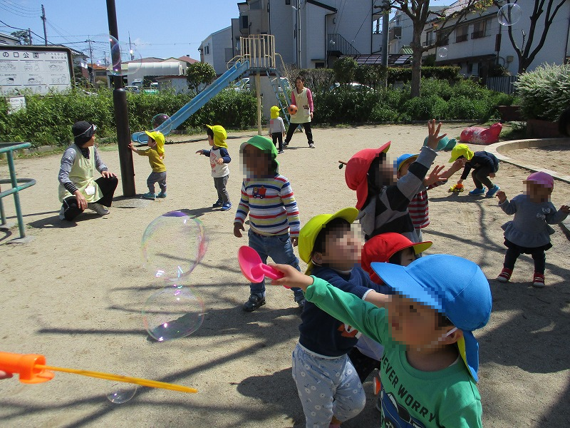 右下の写真は園庭指定公園でシャボン玉に興じる園児たち。
