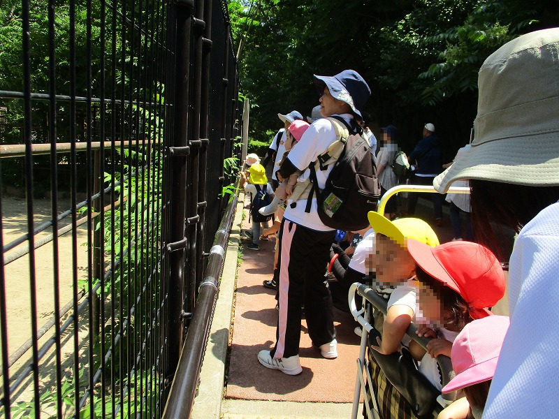 左下写真はカンガルーの檻の前、バギーから身を乗り出して見つめる月齢の浅いオレンジ組(1才児)さん。