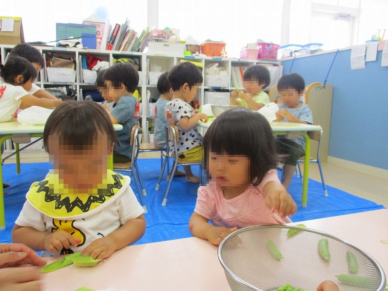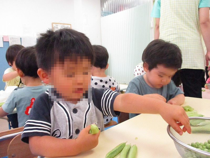 今月の食育保育の一つとしてえんどう豆の皮むきをしました。子どもたち、すごい集中力!せっせと皮から豆を取り出していきます(^-^)。