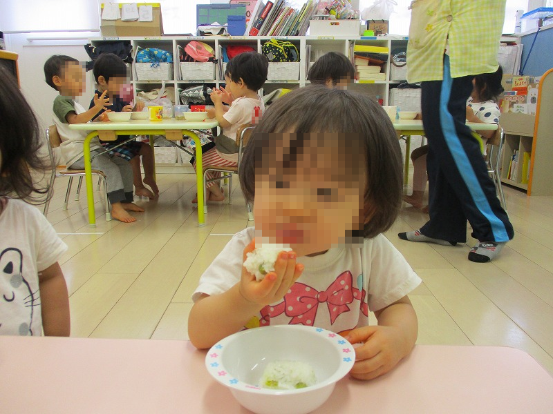 この日のおやつはもちろん「豆ごはん」給食士さんがおにぎりにしてくれました。豆ごはんおにぎりに大きなお口でかぶりつきます(笑)。自分達でむいたお豆の豆ごはん!美味しいね♪
