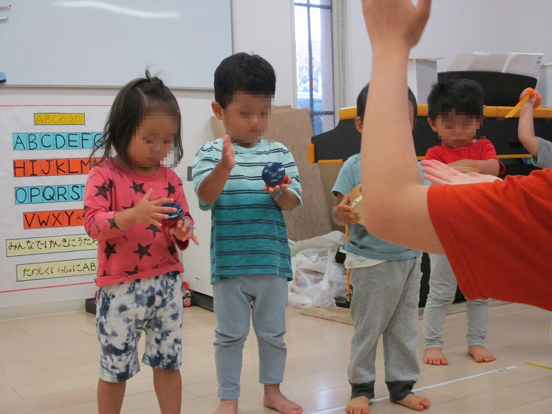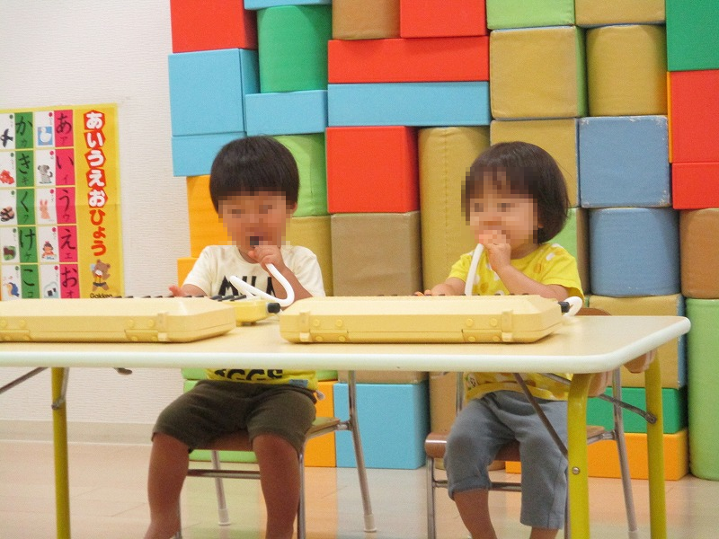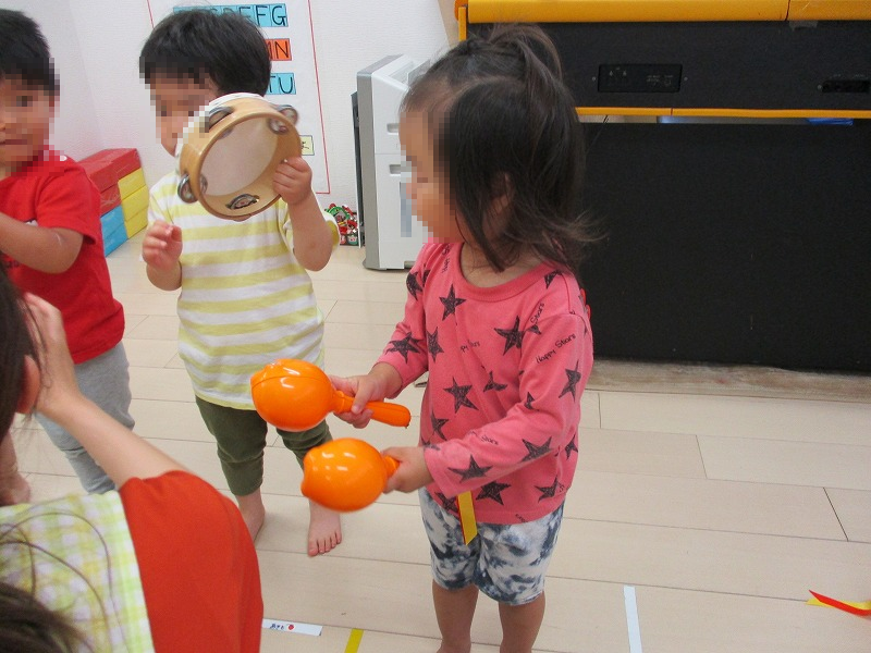 この日は音楽リズム遊びをしました。カスタネット、タンバリン、マラカス、ピアニカ(^^)いろんな楽器に挑戦です。トントン・タンタン♪シャカシャカ♪プープー♪子供たちスゴイ集中力!
