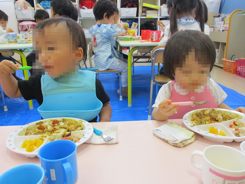 自分達で育てたお野菜のカレー、パクパクモグモグ美味しいね〜♪