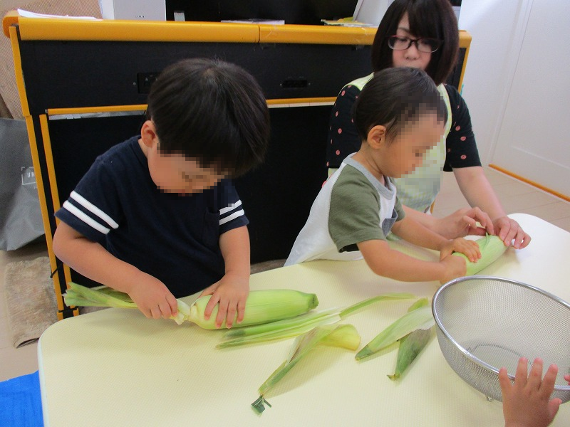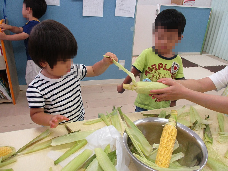 今週の食育はトウモロコシの皮むきもありました。うんしょ、こらしょ、えい♪子供たち頑張って皮をむいて〜ひげをむしって〜(^-^)。