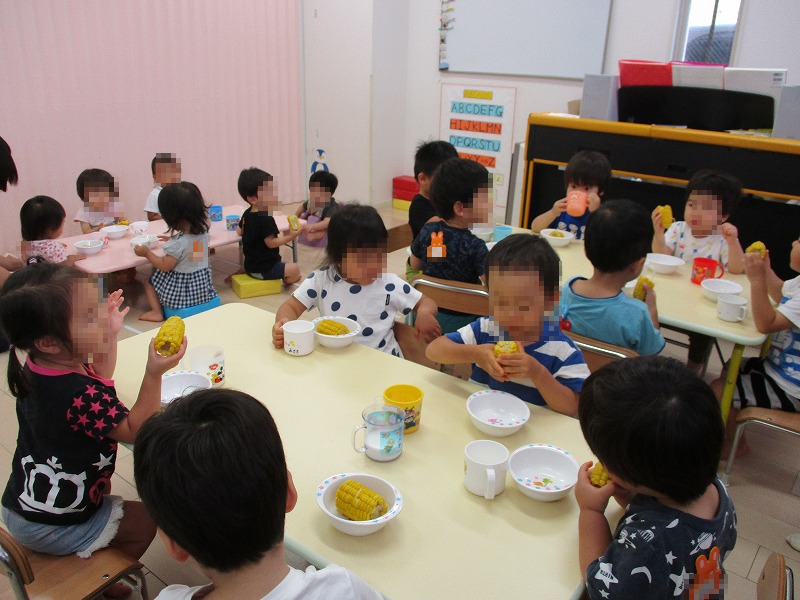この日のおやつはもちろんトウモロコシ♪自分たちで皮をむいたトウモロコシ、皆パクパク食べていました(^o^)。