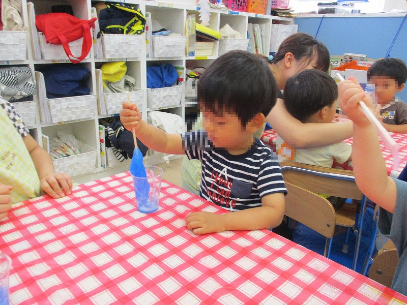 好きな色水を選んで〜ホウ砂を入れて〜まぜまぜ。洗濯糊を入れて〜まぜまぜまぜ。はぁ〜まぜまぜまぜまぜまぜまぜ♪