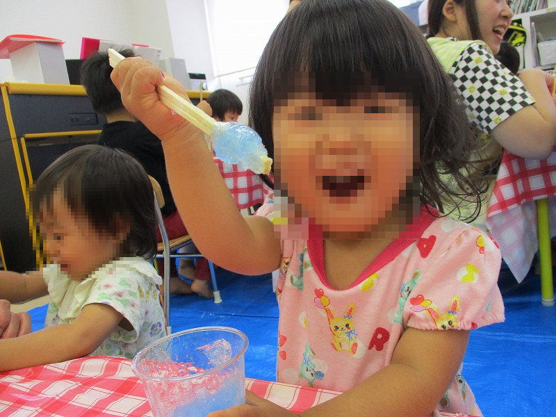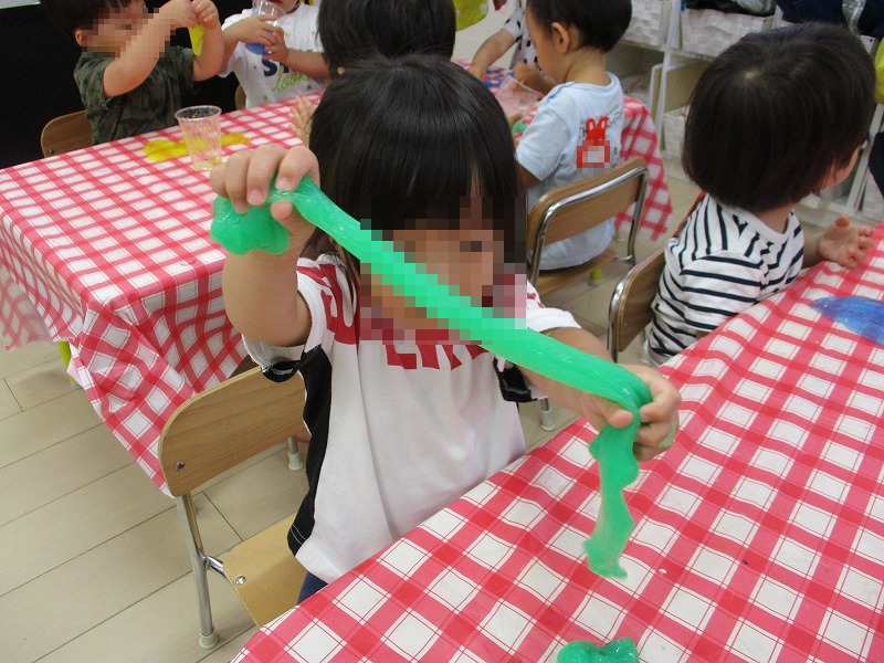 皆きれいなスライムが出来上がりました(^-^)。「つめたーい!」「ぬるぬるぅ〜」「うわぁー○※△□〜」。出来上がったスライムに子供たち大興奮(笑)。
