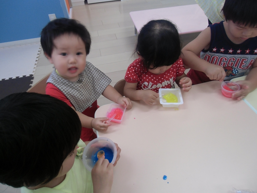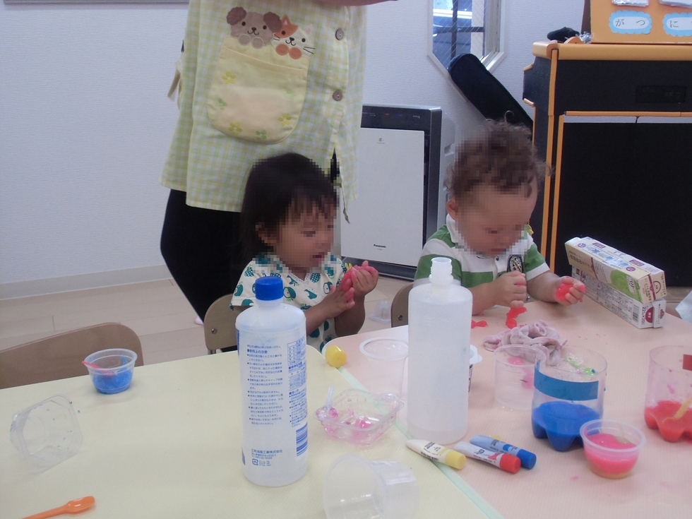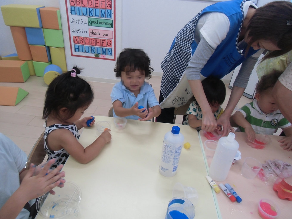 「うわ〜」「気持ちわるーい」「さわると気持ちいいねぇ〜」「できたぁぁ」「〇※△□〜」子天使ちゃん達、嬉しそう!色とりどりのキレイなスライムができあがりました(^0^)