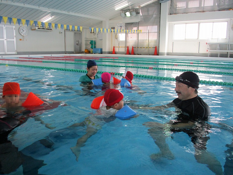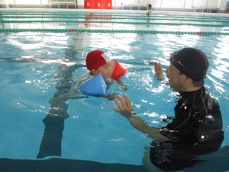 腕浮き輪をつけて大きなプールに挑戦です。初めはこわばっていた子供たちの表情が徐々に笑顔に変わっていきます(^-^)。