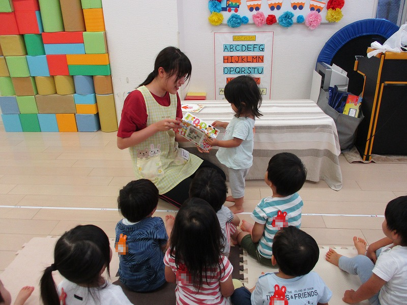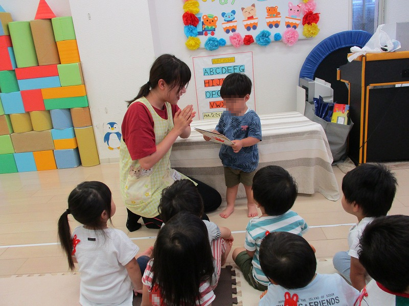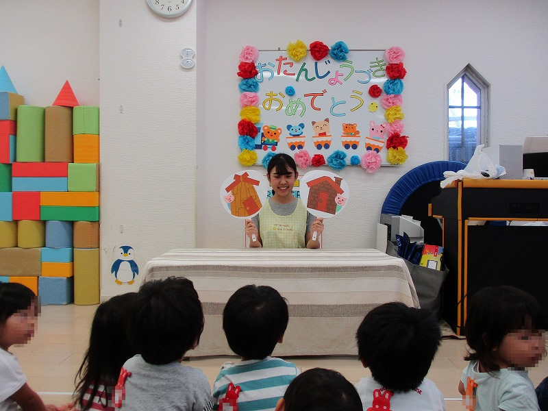 今月はオレンジ組のAくんとSさんの満2歳のお誕生月(^^)。恒例の先生による出し物4連続の後はみんなでお歌のプレゼント♪先生からバースデイカードをもらったら給食士さんの手作りショートケーキ、牛乳でカンパーイ!(^o^)