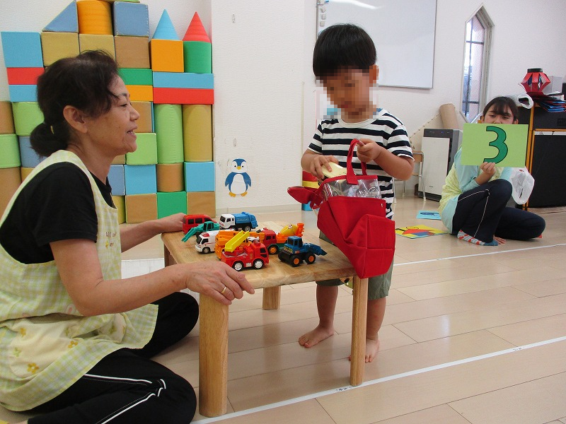 写真は園頭ビニールプール遊び。左下写真は数字遊び。右下写真は工作の時間。