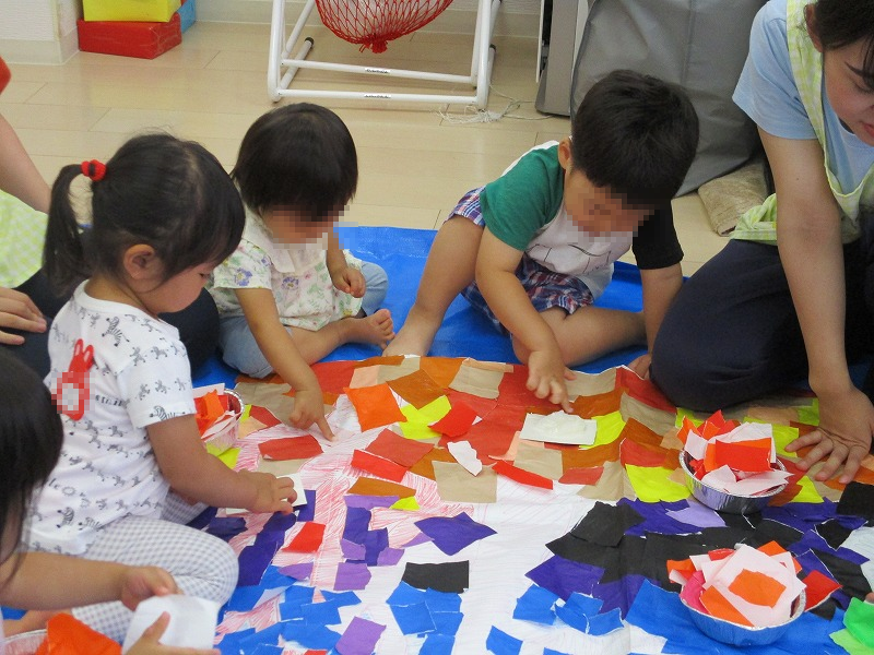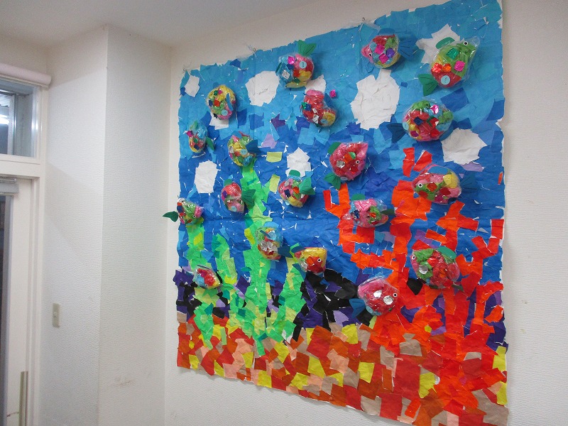 今年の夏祭り、メイン展示物は園児たちによる「貼り絵・海のなか」です。色紙をちぎって、糊をつけて、貼って、それぞれがお魚を作って(^-^)。7月初めから何日もかかって夏祭りの3日前にやっと完成しました。