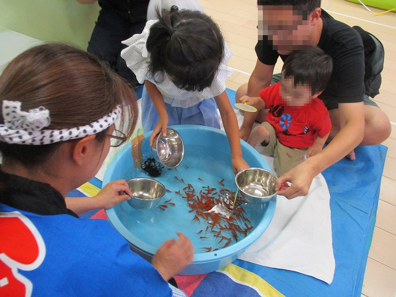 左下写真は「金魚すくいコーナー」、ウェリナでは毎年本物の金魚を使います。本物の金魚すくい、お母さん方にはご迷惑をおかけするかもですが、スイマセン(^^;)(笑)。