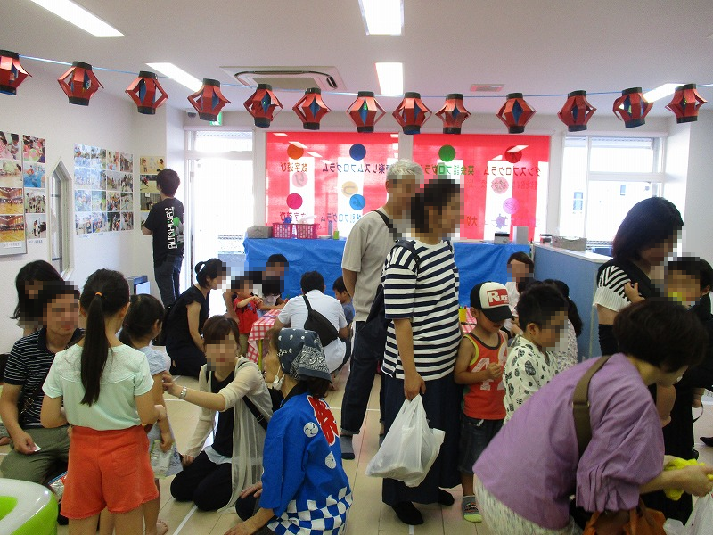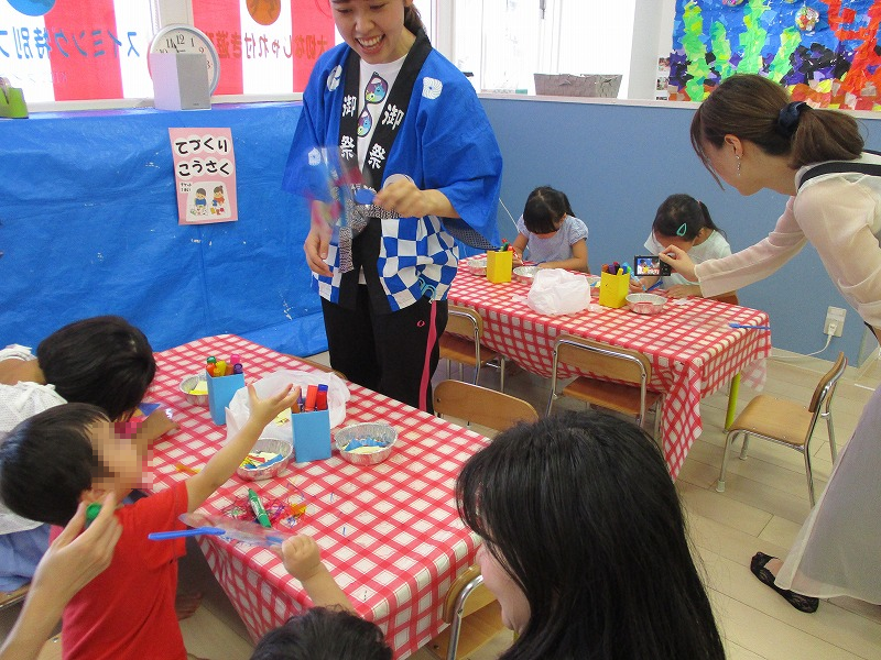 右下写真は「工作コーナー」、透明のうちわに貼ったり描いたり、オリジナルのうちわであおぐ子供たちは嬉しそう(^o^)。