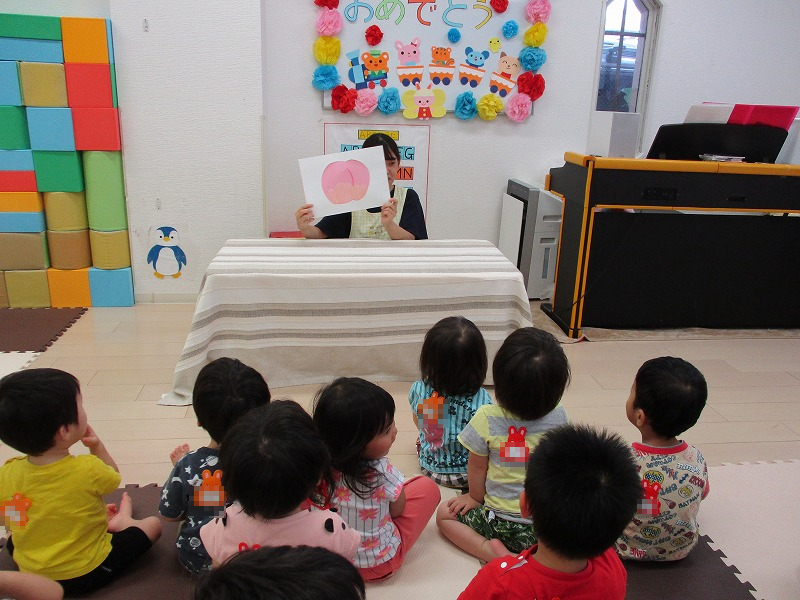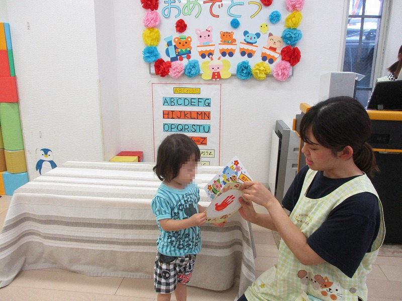 恒例の先生達による出し物を皆で楽しんだ後は、Nちゃんにバースディカードの進呈です。皆でお歌のプレゼント!手作りショートケーキと牛乳でカンパーイ(^o^)/