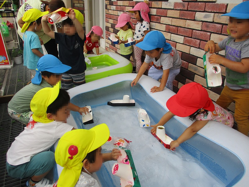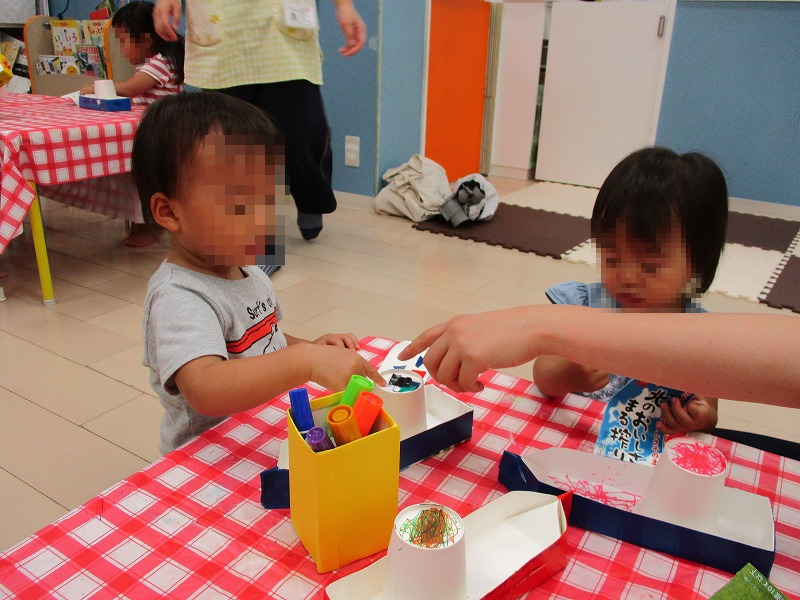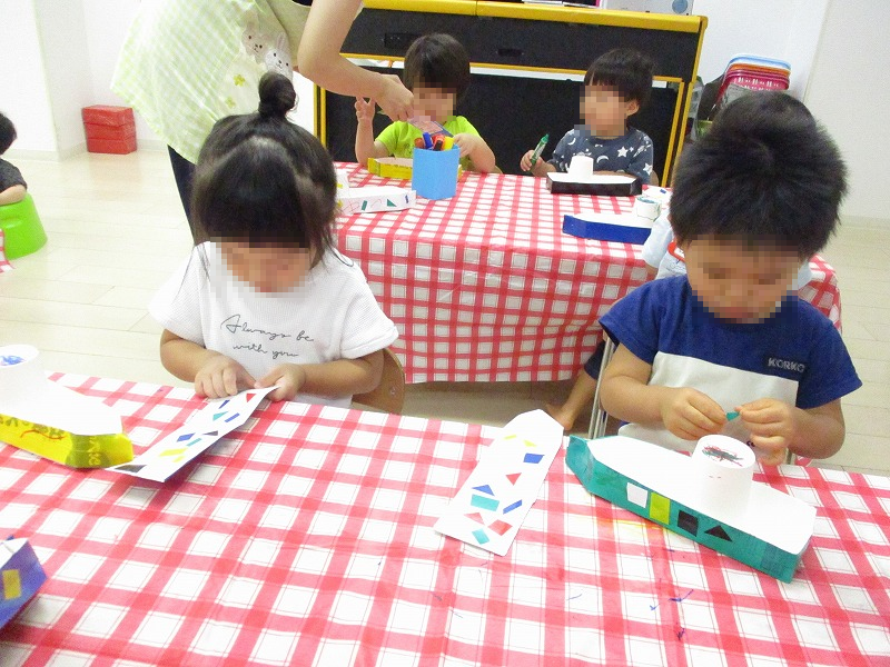 今週の工作は牛乳パックで作ったお舟に描いたり貼ったり、子供たち一人々オリジナルのお舟を作りました。おやつの後は作ったお舟をプールに浮かべて遊びます(^-^)。