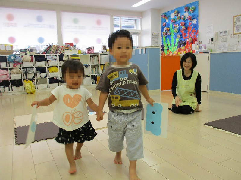 左下写真は「交わり」に着眼した設定保育。2才児と1才児がペアで課題をこなしていきます。