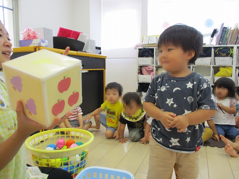 下の写真は数字遊び。サイコロで出た目の数だけカバさんにエサをあげれます。たくさんエサをあげたいから、大きな目が出ると喜びます(笑)。楽しみながら数字の大小を知ることができるんですよ(^-^)。