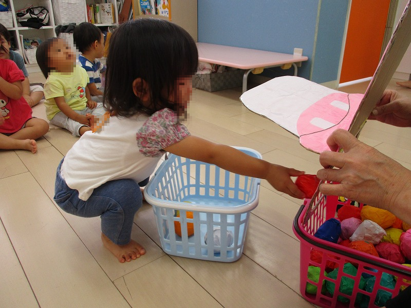 今週は残暑が厳しかったですねーこの日は園外の温度計はなんと35℃・・、もちろんお外遊びは中止です。急遽、ビニールプール遊びに変更です(^-^)。