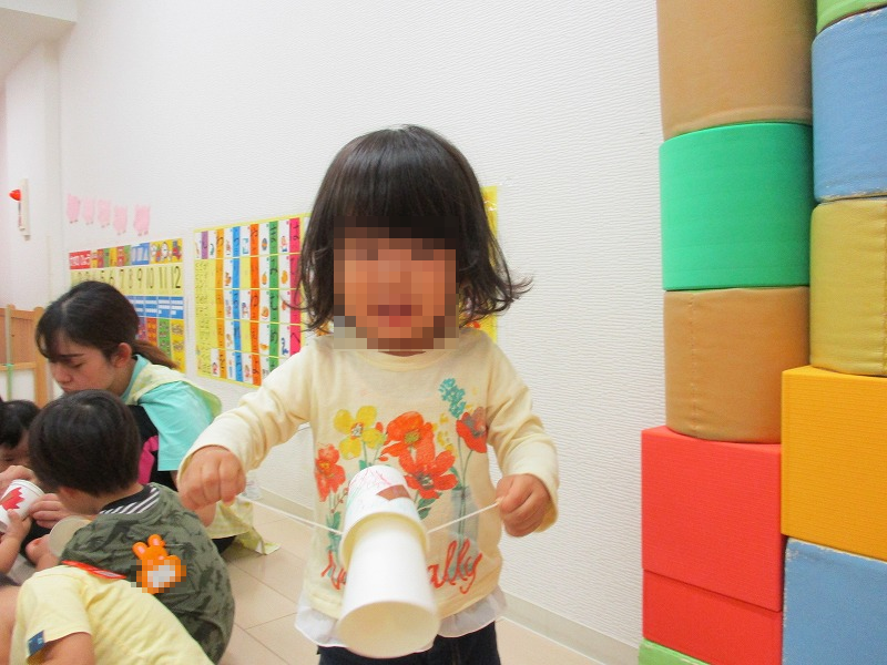 下の写真は今週の工作。紙コップで飛び出す玩具を作りました。自分で作った玩具で遊ぶ子供たちはどことなく誇らしげなんですよ(笑)。
