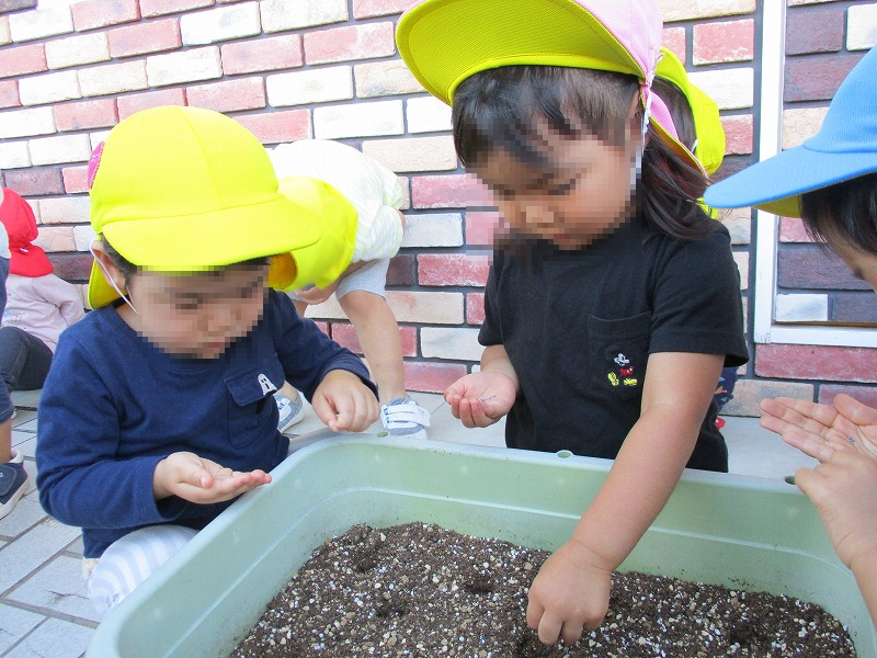 冬野菜と言えばカブ(^^)。少し早いですがプランターの設置場所の日照時間とか考えて1ヶ月早く種まきをしました(去年はこの方法で大収穫でした!)「豆粒より小さい種から何ができるのかなー(^^)」。